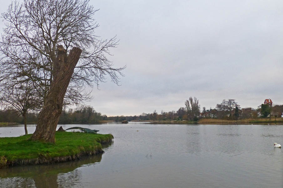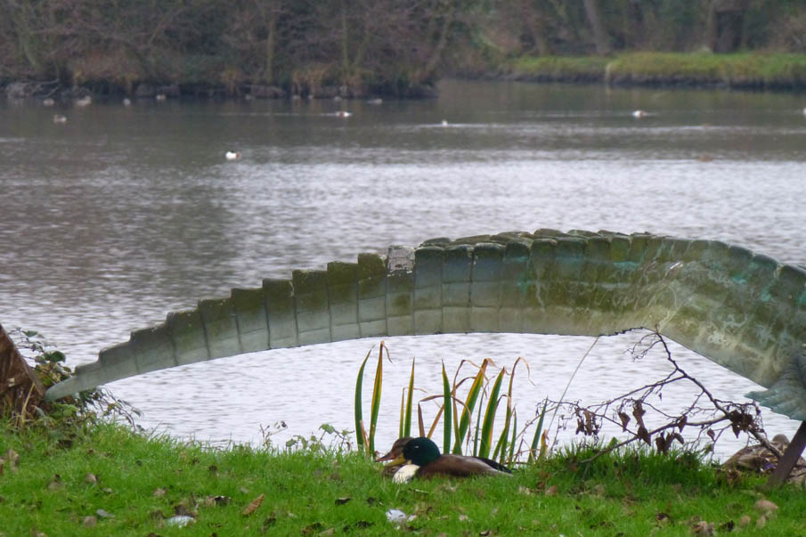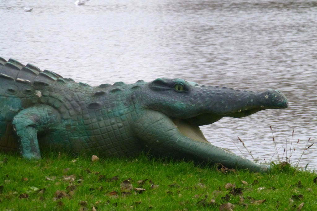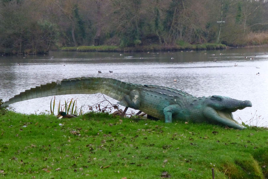 The history of the crocodile with its sword-like tail is not known but an early map of the Meare (published by Philip Dawes from a 1930s guidebook to Thorpeness) shows an imaginative lay-out inspired by Peter Pan and Robinson Crusoe. Islands are named: Peter Pan’s property, Wendy’s house, Crusoe’s island, and to the north Pooks Hill with a crocodile and sign ‘Beware of the crocodile’ snarling across the stream at the dragon on the Dragon’s Den. Early photographs ( a corner of the Meare c1930 p.4 image 9 ) show a, presumably wooden, dragon on top of shelter made out of an upended rowing boat. There are no photographs of the dragon, which is now propped up at the rear and if not the original it may be an early replacement now moved to the small island near the landing stage, | |||||||||||||||||||||||