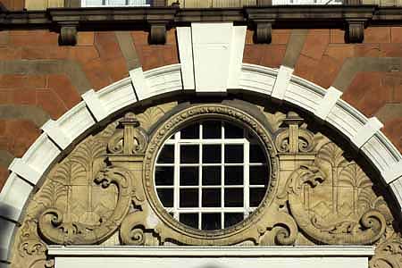 The grotesque animals are leafy variations on the griffin headed arabesques which flank the heraldry on the doorway of Blickling Hall. Here the palm trees could allude both to the range of produce available from Roofe's the grocers and to the possibilities open to the investors in the Stock exchange sited above the shop. The ships in full sail are a long established emblem of good fortune -again appropriate for the investors on the local stock exchange. |