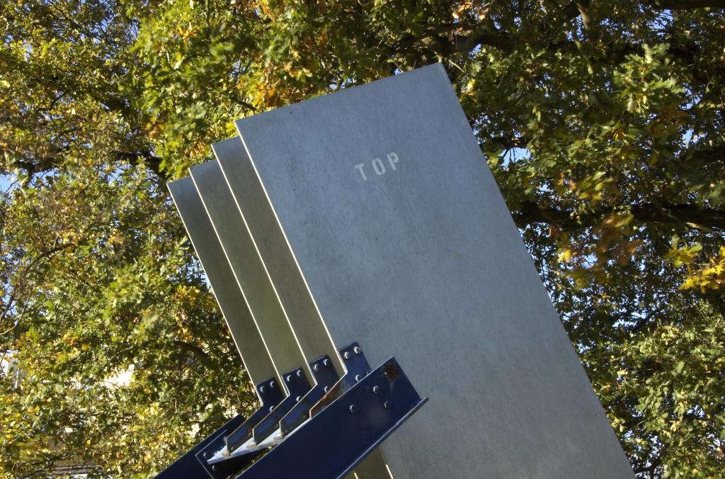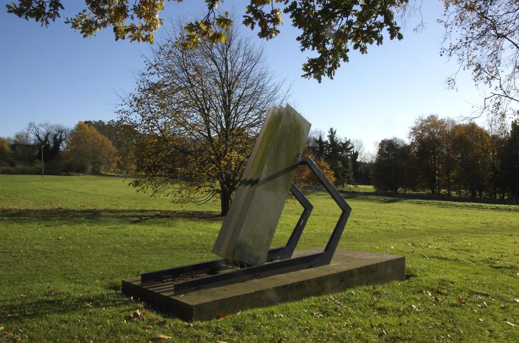 Large abstract sculpture comprised of four rectangular aluminium sheets, mounted at an angle in a parallel arrangement between two blue-painted steel supports on a wedge-shaped concrete base. The siting, at an angle to the Music Centre, offers the major viewpoint from the path leading through to the University Plain, which emphasizes the debt to Anthony Caro in the geometry of the blue painted steel frame, to which Hoskin adds his own personal note in the aluminum panels. | |||||||||||||||||||||||