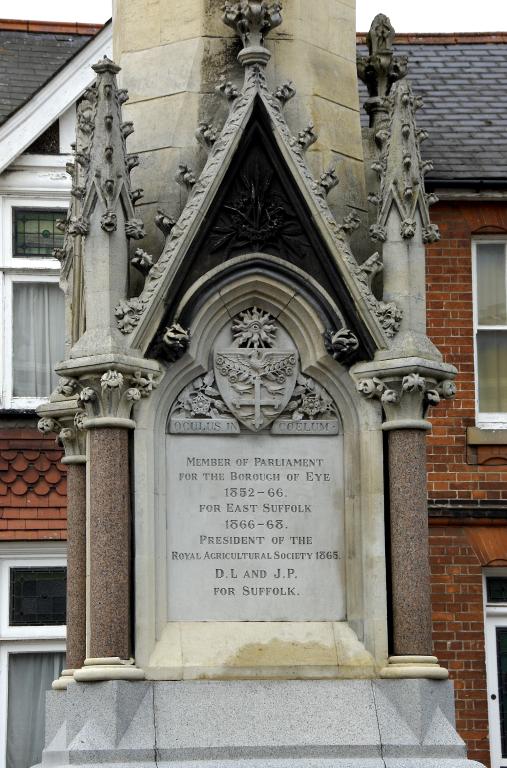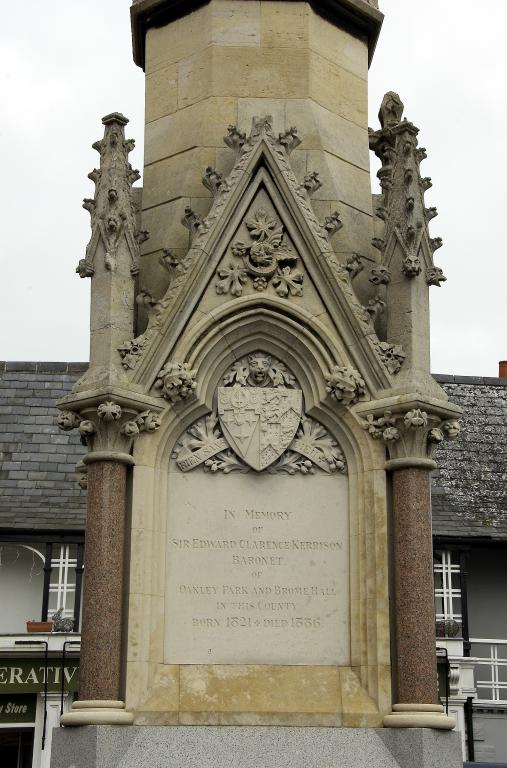 | Inscriptions | Inscriptions: FRONT: OCULUS IN COELUM/ MEMBER OF PARLIAMENT FOR THE BOROUGH OF EYE/1852 – 1866/ FOR EAST SUFFOLK/1866-68/PRESIDENT OF THE ROYAL AGRICULTURAL SOCIETY 1865. D.L. AND J.P./FOR SUFFOLK RIEN SANS DIEU/ IN MEMORY/ OF / SIR EDWARD CLARENCE KERRISON/ BARONET/ OF/ OAKLEY PARK AND BROME HALL/ OF THIS COUNTY/BORN 1821 DIED 1886 A GENEROUS LANDLORD/ A FRIEND TO THE POOR/ A ZEALOUS AND POWERFUL/PROMOTER OF GOOD WORKS/ EDUCATIONAL AND BENEVOLENT/IN THIS DISTRICT/AND THROUGHOUT/THE EASTERN COUNTIES THIS MONUMENT IS ERECTED/BY/MANY FRIENDS/BOTH RICH AND POOR/WITH GRATEFUL RECOLLECTIONS/OF HIS WIDE SYMPATHIES/AND MUNIFICENT DEES./A.D. MDCCLXXXVIII | |||||||||||||||||||||||