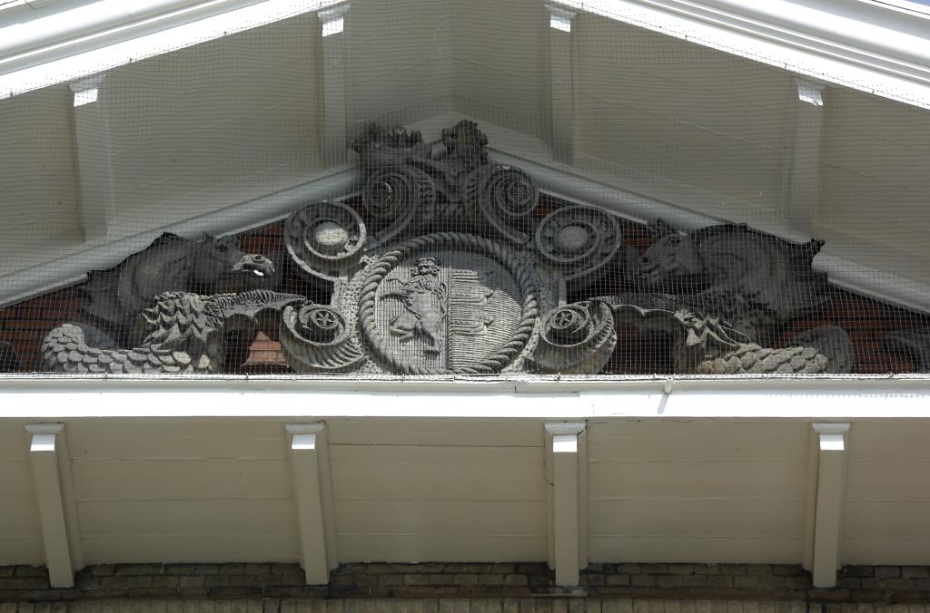 The facade of the Old Custom House facing the docks is strikingly classical with four columns supporting a deep pediment decorated with the Borough of Ipswich's coat of arms - a rampant lion with the sterns of three galleons at sea are set within an elaborate cartouche held by two wyverns. | |||||||||||||||||||||||