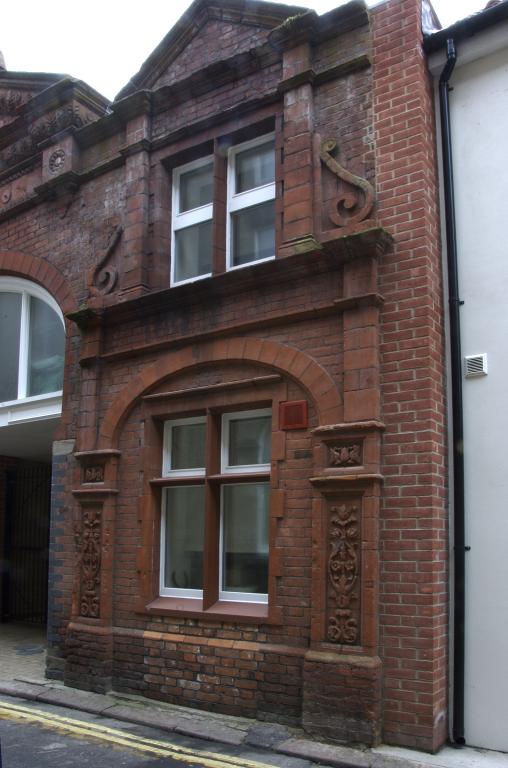 A facade with a wide central opening, which originally fronted a livery stable. The upper cornice is decorated with alternating fleur-de lys and roses, and the four decorative panels have 'grotesque' flowers around a central stem. | |||||||||||||||||||||||